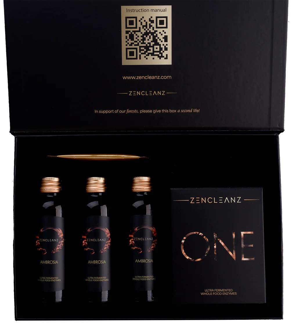 The ZenCleanz ONE is our flagship cleanse kit and the step 1 of our whole body 5-Element detoxification system. The ZenCleanz ONE is a revolutionary intestinal and colon cleanse that has the power to clear phenomenal quantities of intestinal mucoid plaque from the body in a single day. This power-packed fermented super enzyme cleanse kit contains only all-natural and organic ingredients, which include the AMBROSIA, a liquid enzyme formula, an Intestinal Management powder, and the Fiber Crystals tablets. Together, these enzymes help clear the body of long-term intestinal mucoid plaque: the contributory source of all illnesses. The ZenCleanz ONE discharges old waste, absorbs toxins from the intestinal walls, helps regulate and restore intestinal flora, and by these facts, improves immunity.